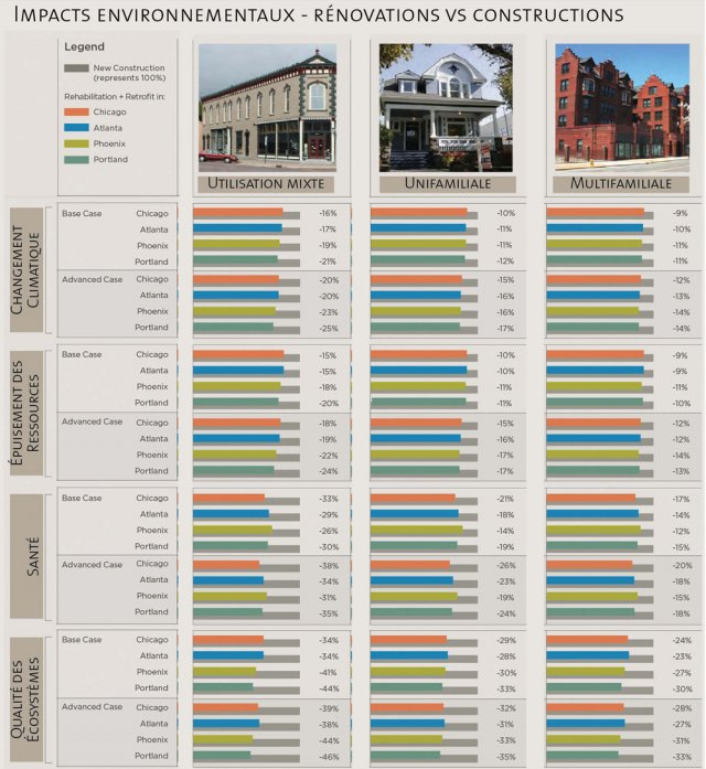 construire versus-renover. Impact environnemental. Etude the National Trust for Historic Preservation, The Greenest Building: Quantifying the Environmental Value of Building Reuse, 2011 – Source Ecohabitation.com